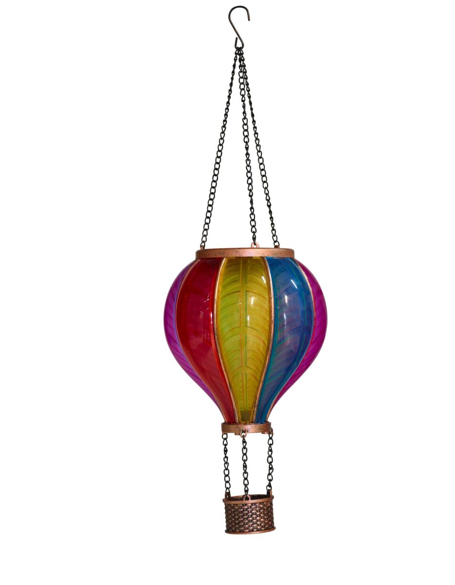 Lanterne solaire ballon montgolfière arc-en-ciel avec LED blanc chaud et effet flamme réaliste.