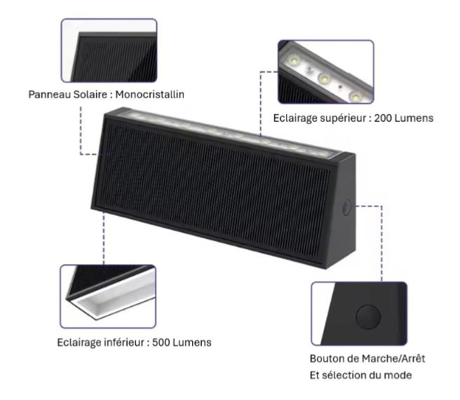 Caractéristiques principales de l’applique murale solaire Miter 700 lumens :
