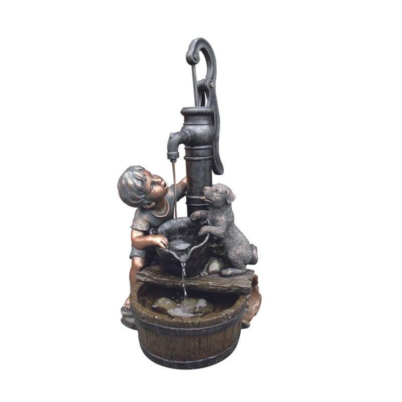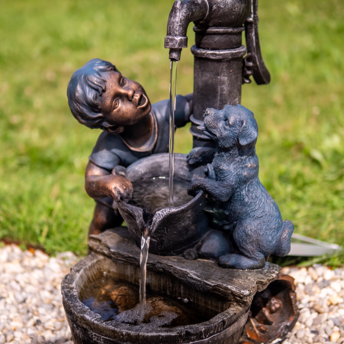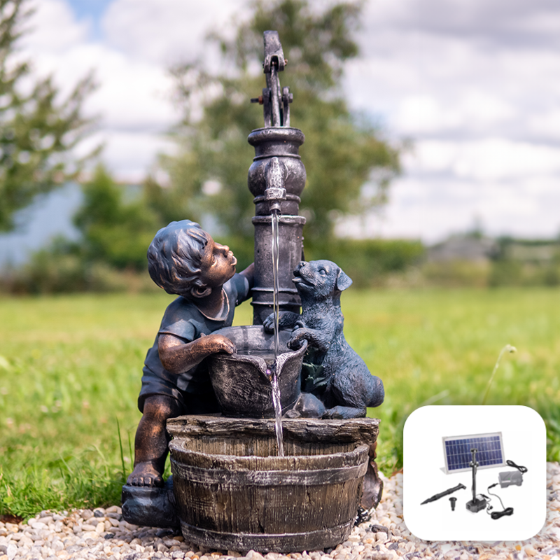 Apportez une touche de charme à votre espace extérieur avec la fontaine Regina solaire et secteur. Cette fontaine captivante représente un enfant et un chien se rafraîchissant à un point d'eau, une scène qui évoque les plaisirs simples de l'enfance. Fabriquée en polyrésine de haute qualité, cette fontaine combine durabilité et esthétique, garantissant une longue durée de vie même en extérieur.