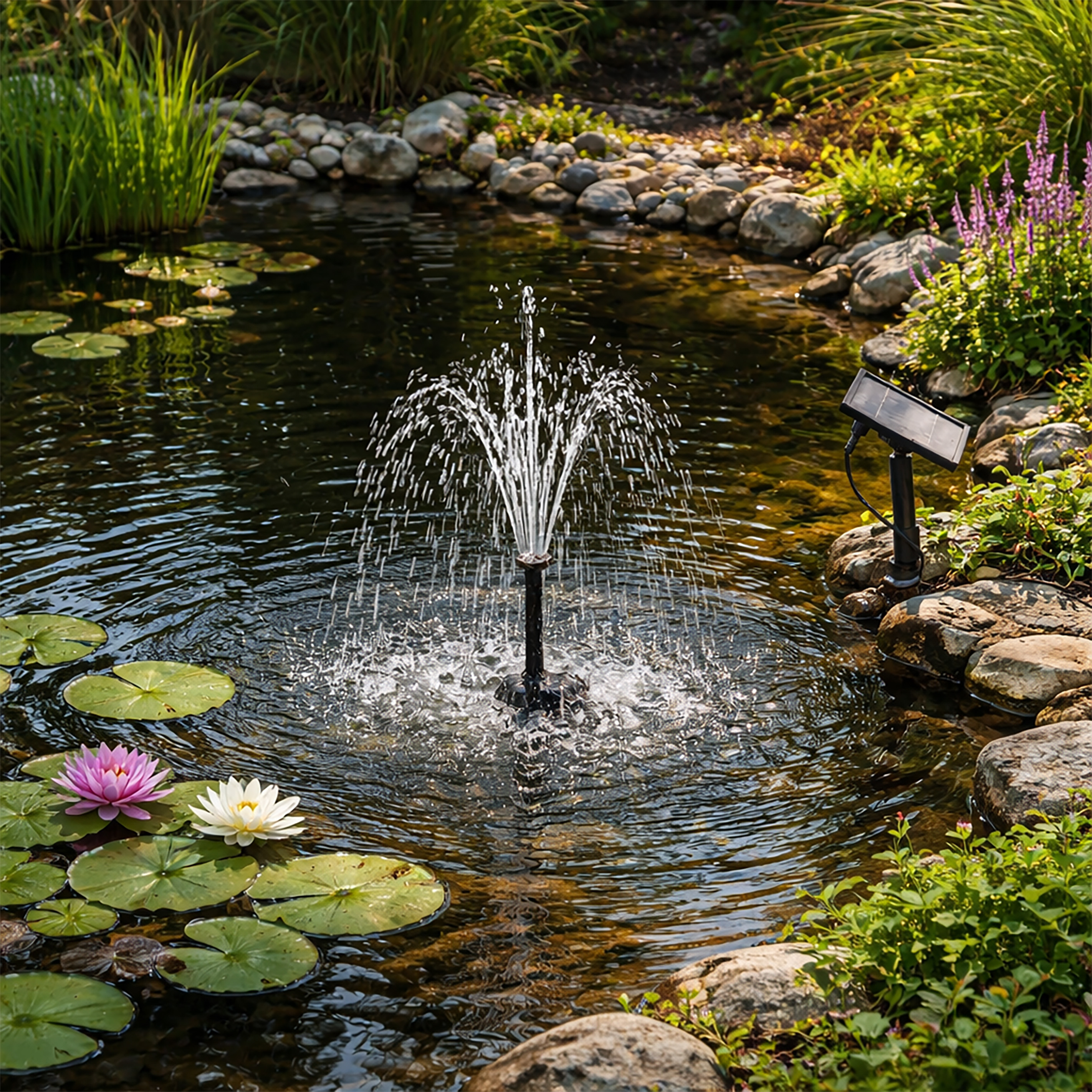 Le kit pompe solaire Fountain est totalement autonome, facile de mise en œuvre en quelques minutes, pour réaliser des petits jeux d'eau dans vasque, petit bassin (moins de 200 L recommandé).